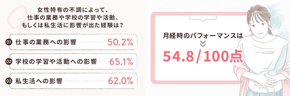 ▎女性特有の不調によって、過半数以上の女性が学校や仕事、私生活への影響を経験。仕事のパフォーマンスへの影響を経験した女性も多い。