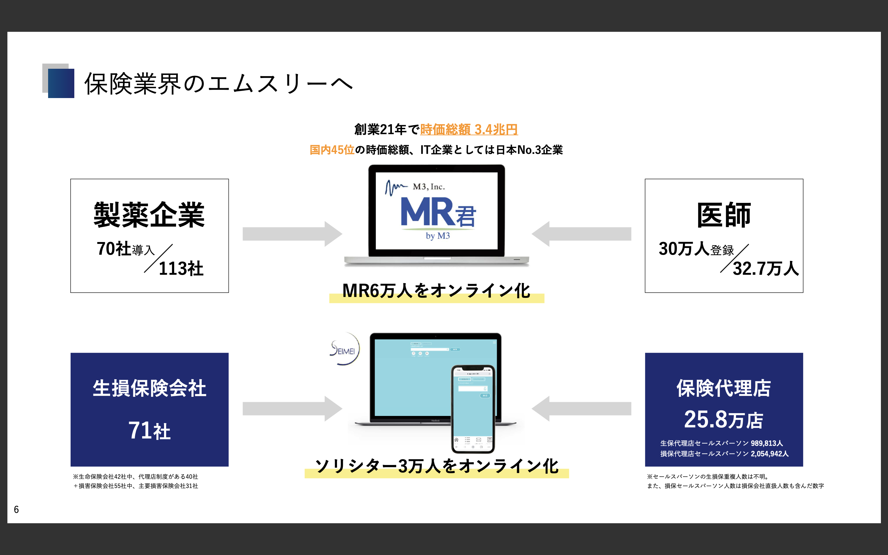 エムスリーは製薬業界で大成功している会社ですが、保険業界も同じ業界構造であることに気づき、ソリシター君では保険会社と保険代理店及び保険募集人を結ぶプラットフォームを構築しています。