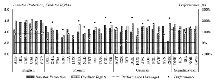 注:データは2004年から2018年の算術平均を使用している。Investor ProtectionおよびCreditor Rightsの数値は左軸を基準としており、Performanceについては右軸を基準としている。Performance(Average)は、法の起源ごとの算術平均であり右軸を基準としている。デンマークの運用パフォーマンスについては欠損値である。国名コードはISO 3166-1 alpha-3を使用している。