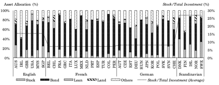 注:データは2004年から2018年の算術平均を使用している。Stockは株式、Bondは債券、Loanは貸付金、Landは不動産、Othersはその他の資産における保有比率である。(左軸)変数Stock/Total Investment(Average)は法の起源ごとの算術平均である。(右軸)国名コードはISO 3166-1 alpha-3を使用している。