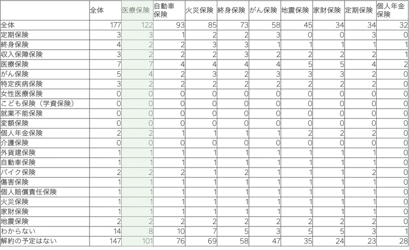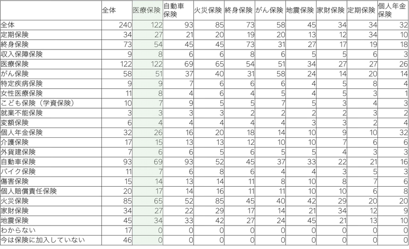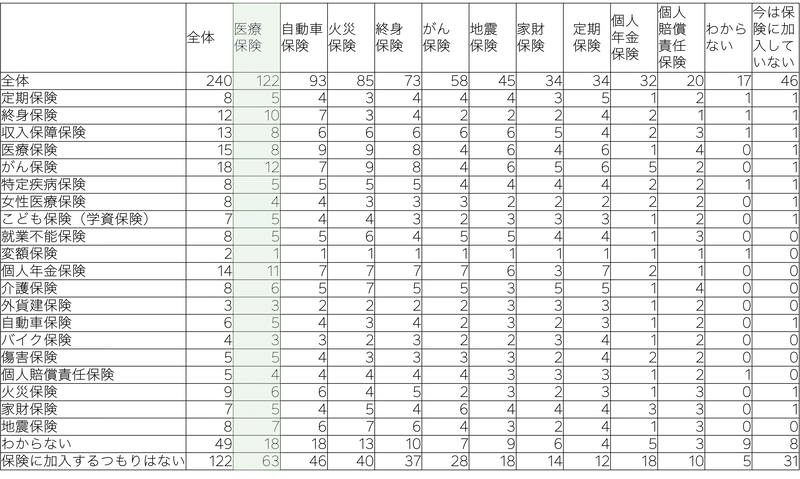 Q1の回答で、全体数(N数)に対して10%以上の加入率の保険種類について抜粋し、N数でクロス集計を実施しました。