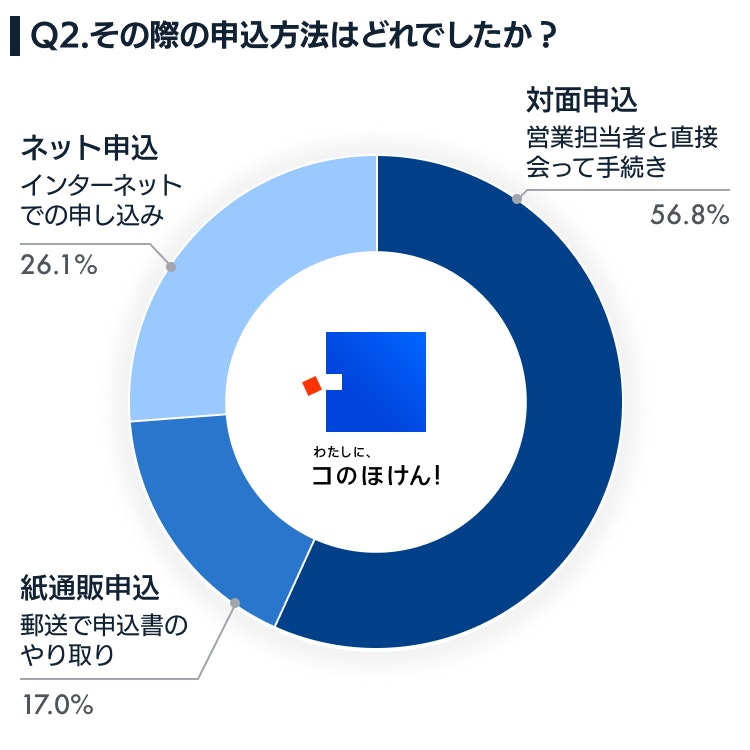 生命保険などの申し込み手続きの現場では、従来型の営業担当者と直接会って手続きする方法で申し込みされる方が多いことがわかりました。