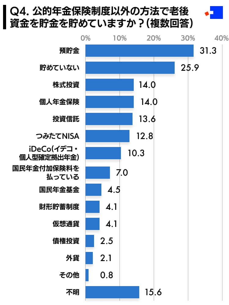 | Q4 | 公的年金保険制度以外の方法で老後資金を貯めていますか?(複数回答) | % |