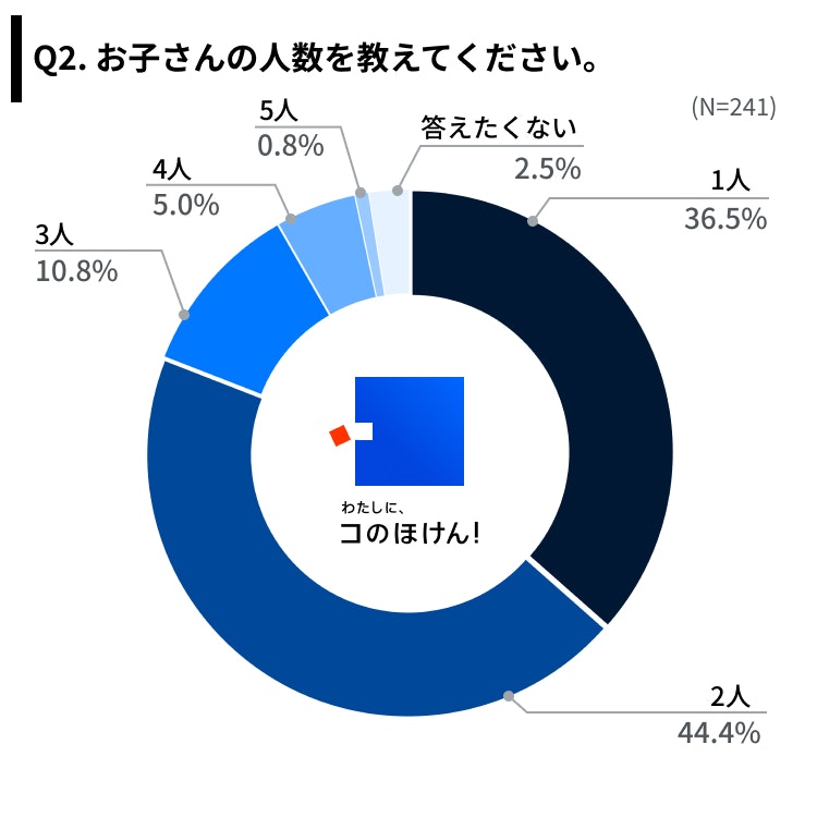 子どもの人数について、もっとも多かった回答は「2人」44.4 %です。次点で「1人」36.5 %、「3人」10.8 %と続きます。「ひとりっ子」ではない割合は61.1 %となりました。