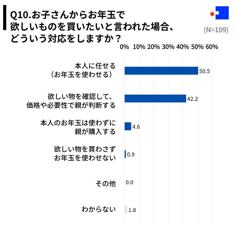 | Q10 | お子さんからお年玉で欲しいものを買いたいと言われた場合、どういう対応をしますか? | % |