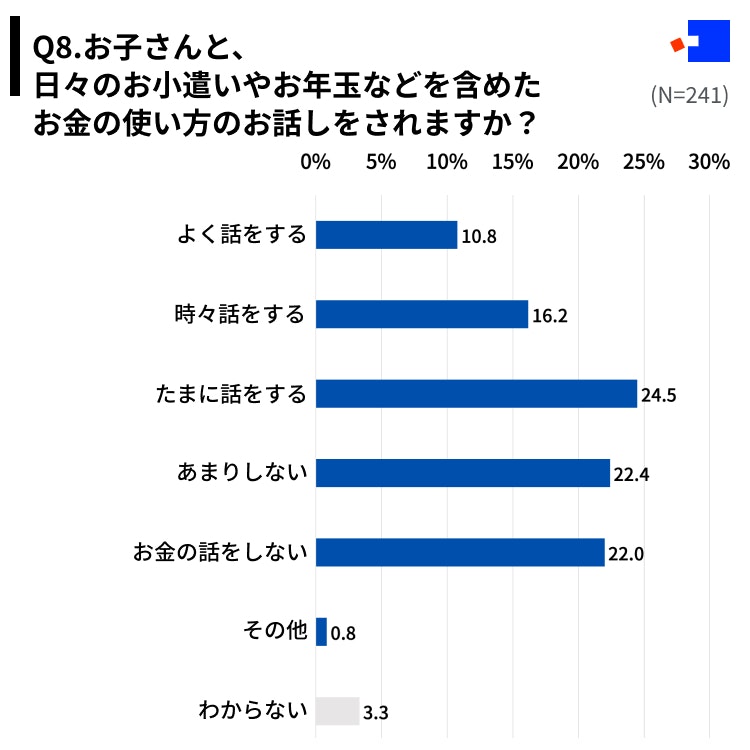 | Q8 | お子さんと、日々のお小遣いやお年玉などを含めたお金の使い方のお話しをされますか? | % |