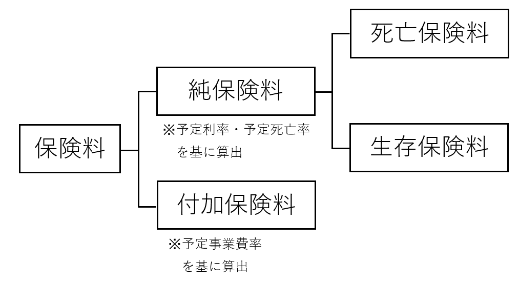 <保険料の内訳> 保険料は純保険料と付加保険料から構成され、純保険料は予定死亡率や予定利率を基に、付加保険料は予定事業費率を基に算出されます。
