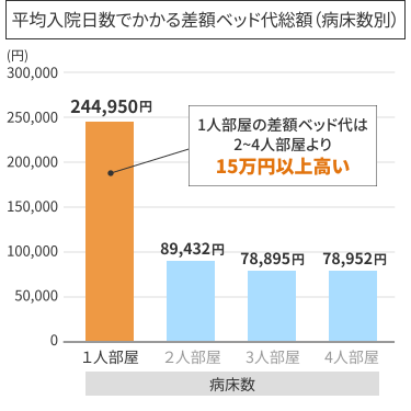 上のグラフで分かる通り、平均入院日数で試算すると、1人部屋の差額ベッド代は2・3・4人部屋より15万円以上高くなります。
